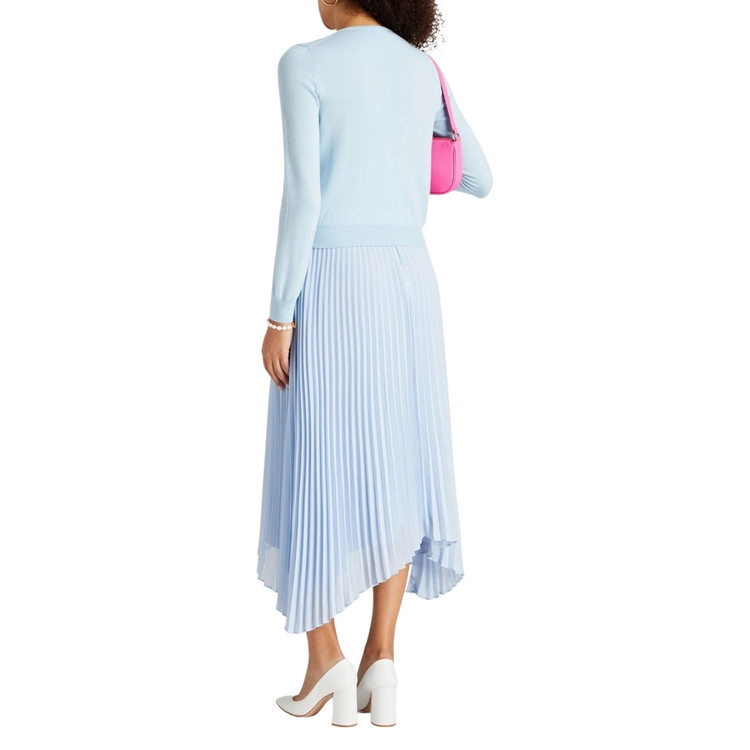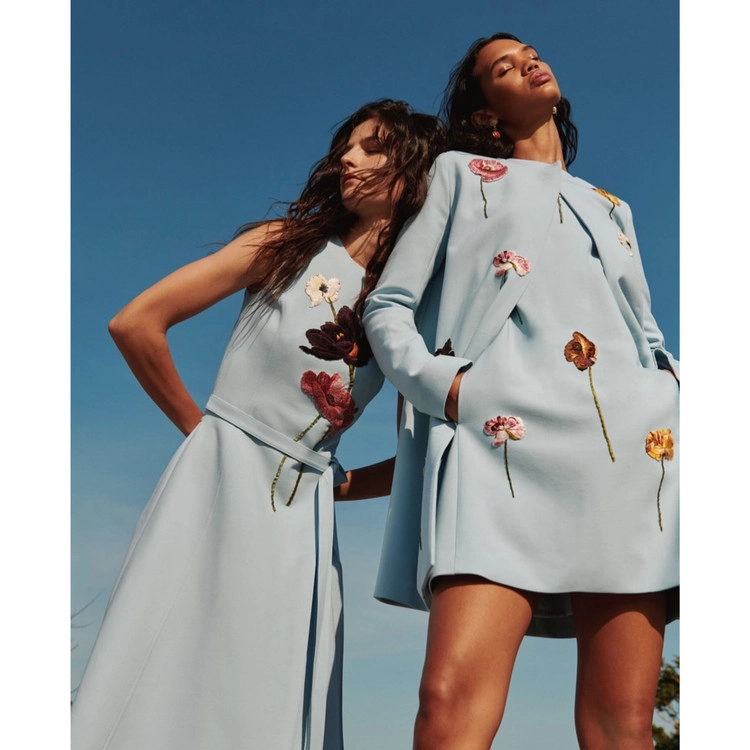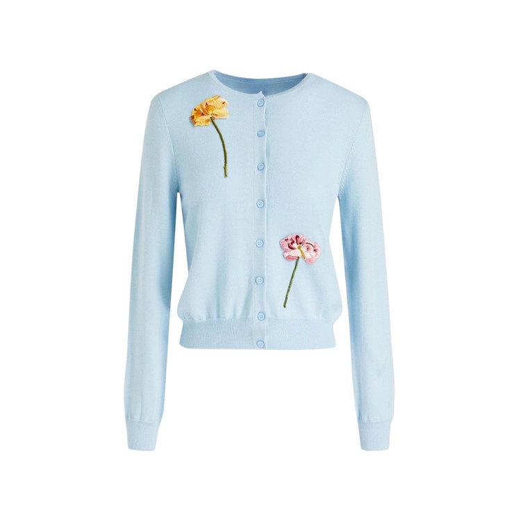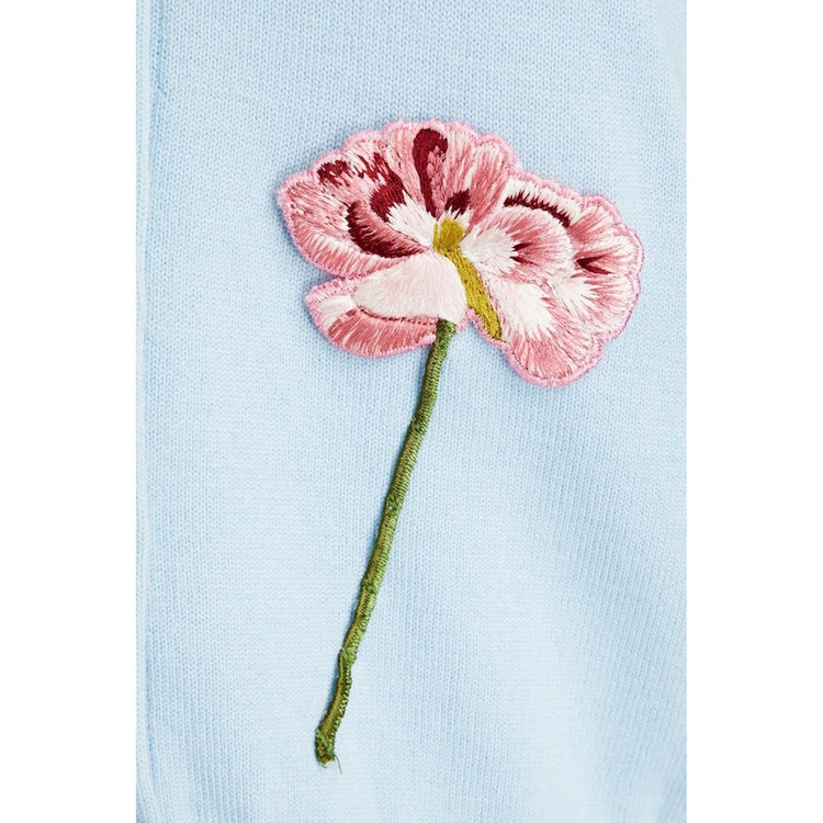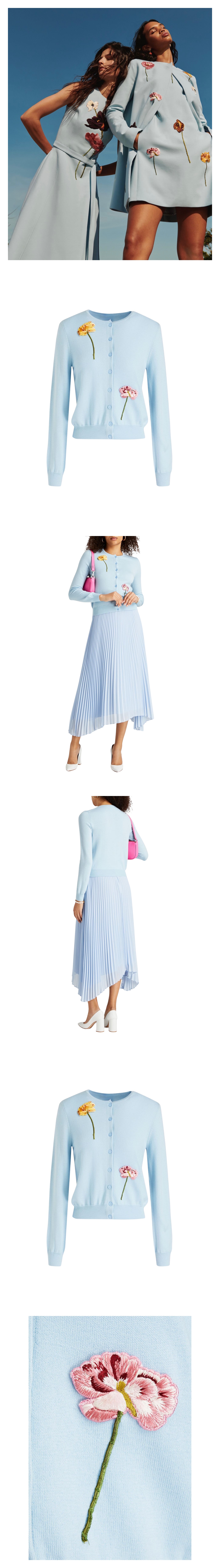 감각적인 플로럴 아플리케가 펼쳐진 라이트 블루 컬러의 버진울 가디건을 만나보세요.