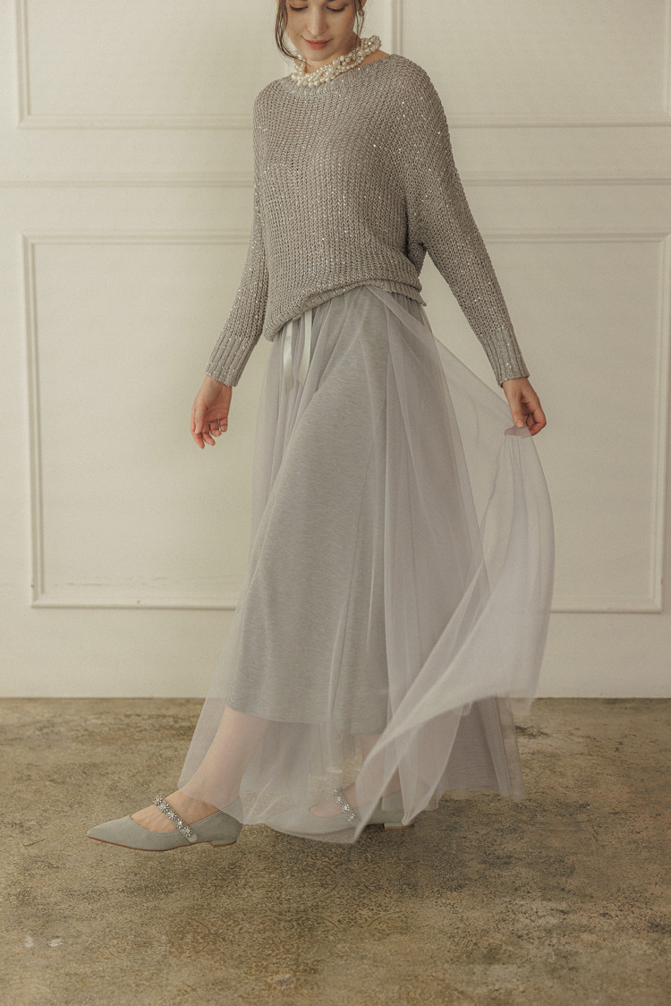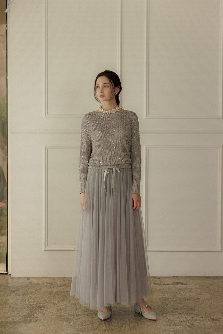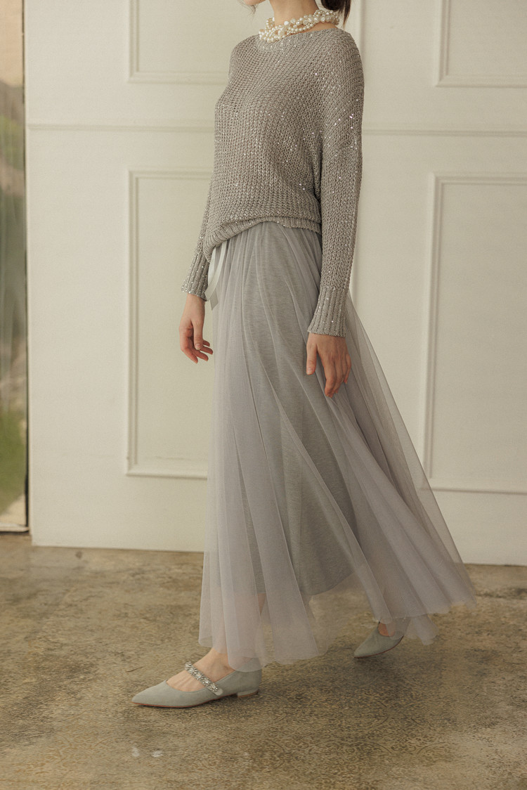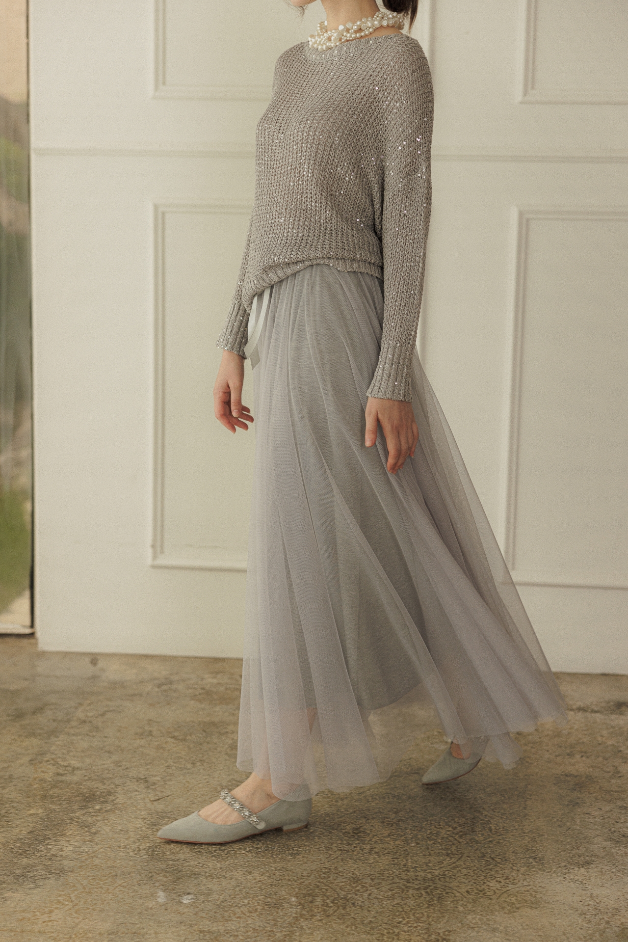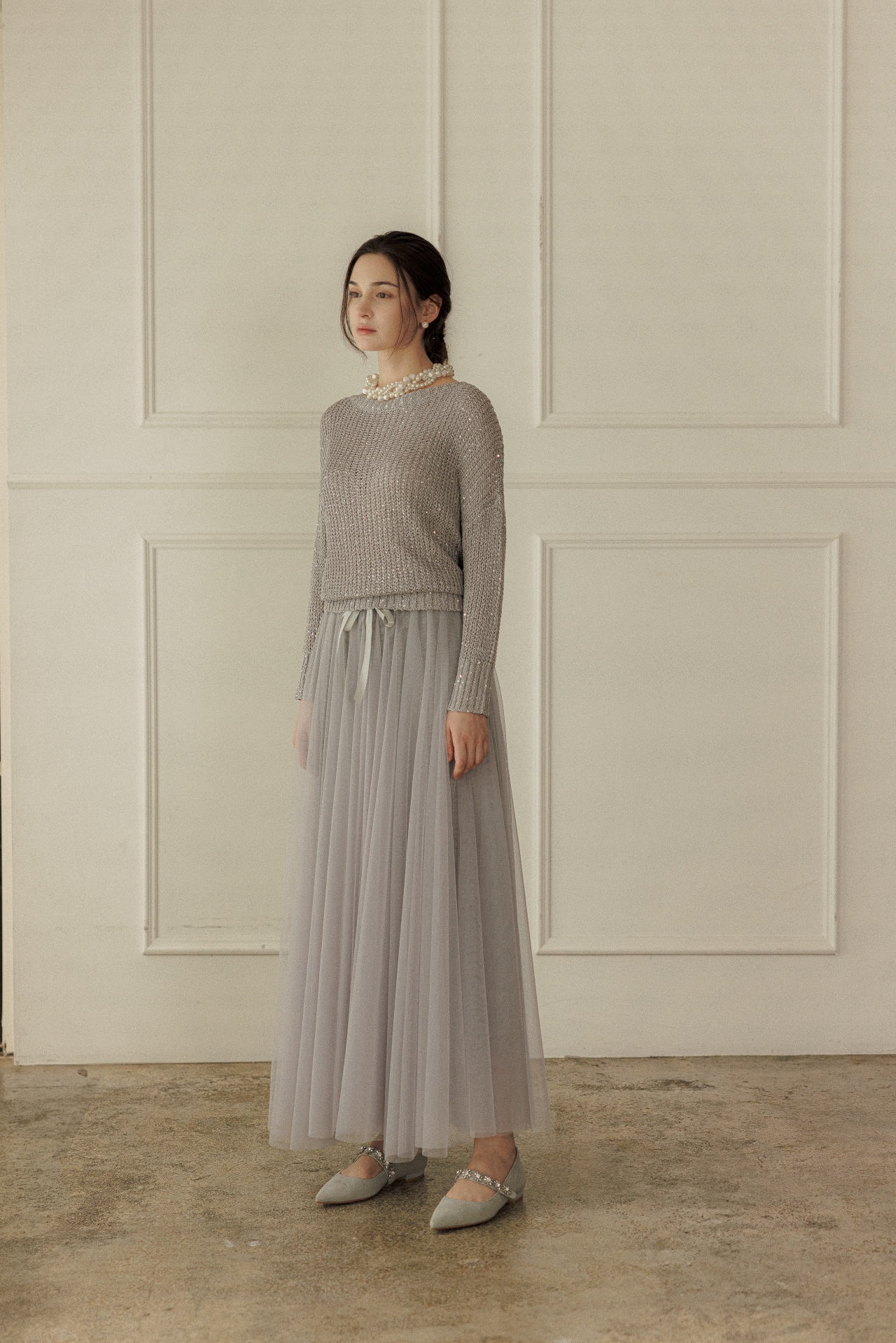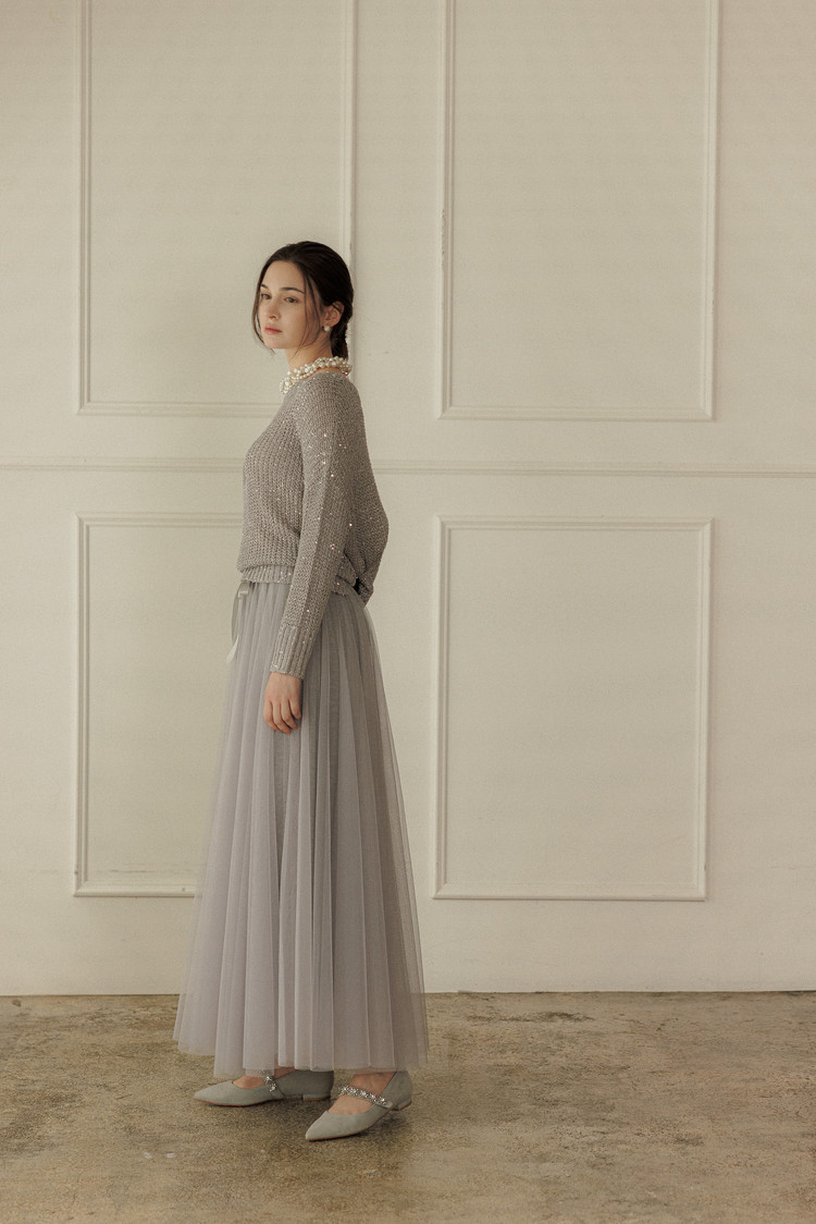 튤 소재를 주름 잡아 층이 진 실루엣을 이루었으며, 비스코사 안감을 덧대 마감했습니다. 웨이스트 밴드의 리본 트리밍이 포인트로 전체적으로 볼륨감 있게 주름을 잡은 튤 스커트이며, 부드러운 시스루 튤을 섬세하게 주름 잡아 심플한 A라인 실루엣을 그려냈습니다.