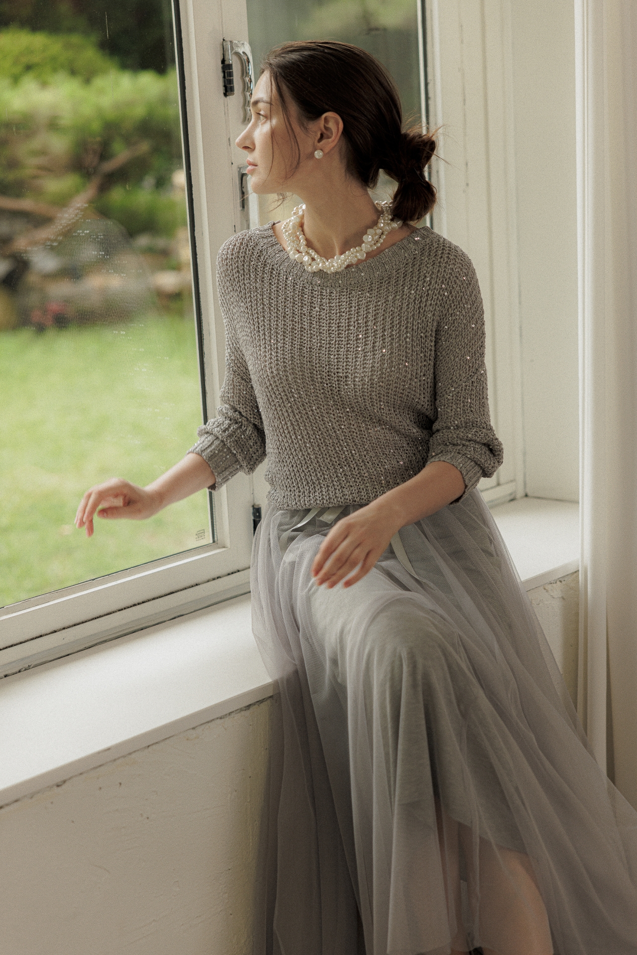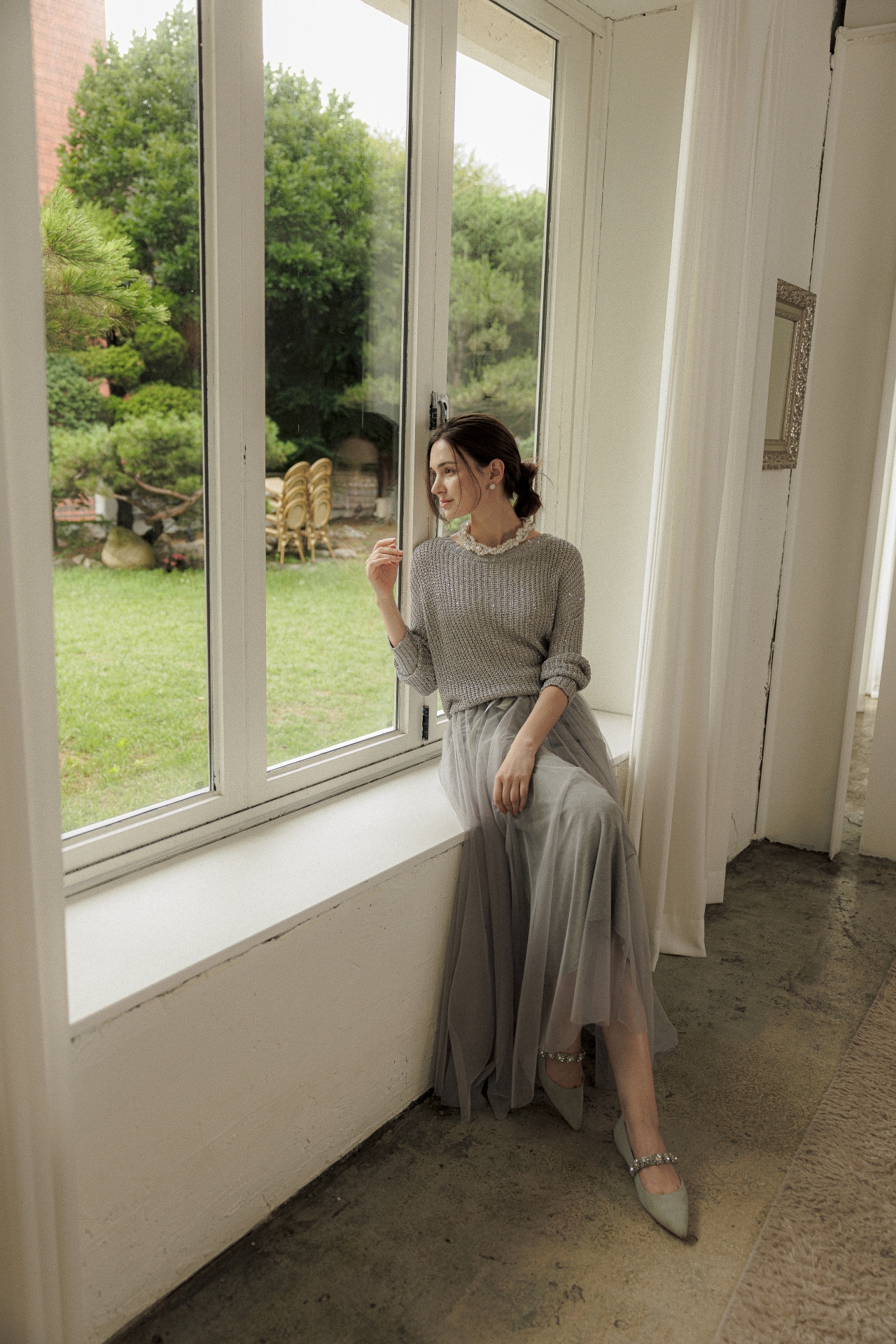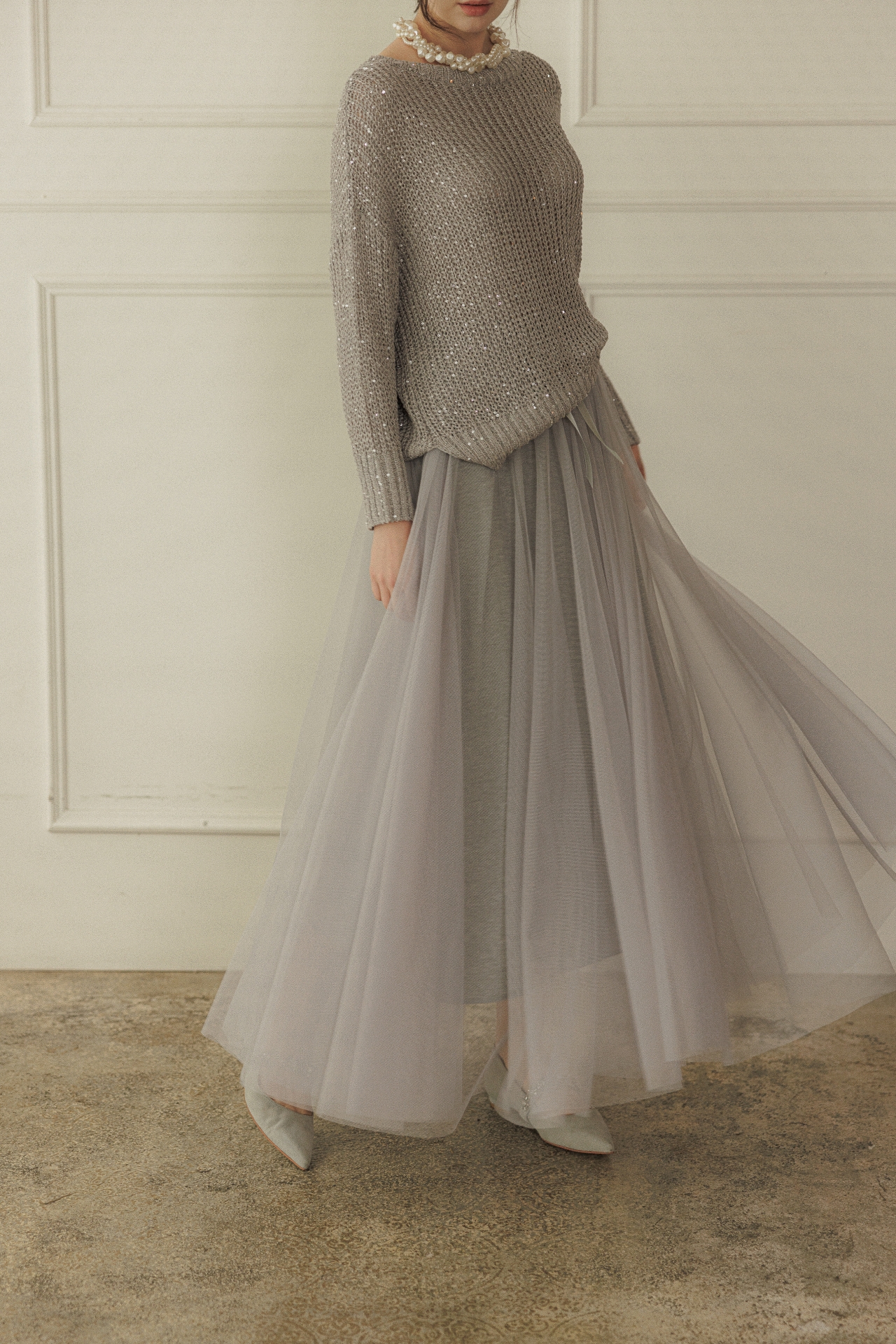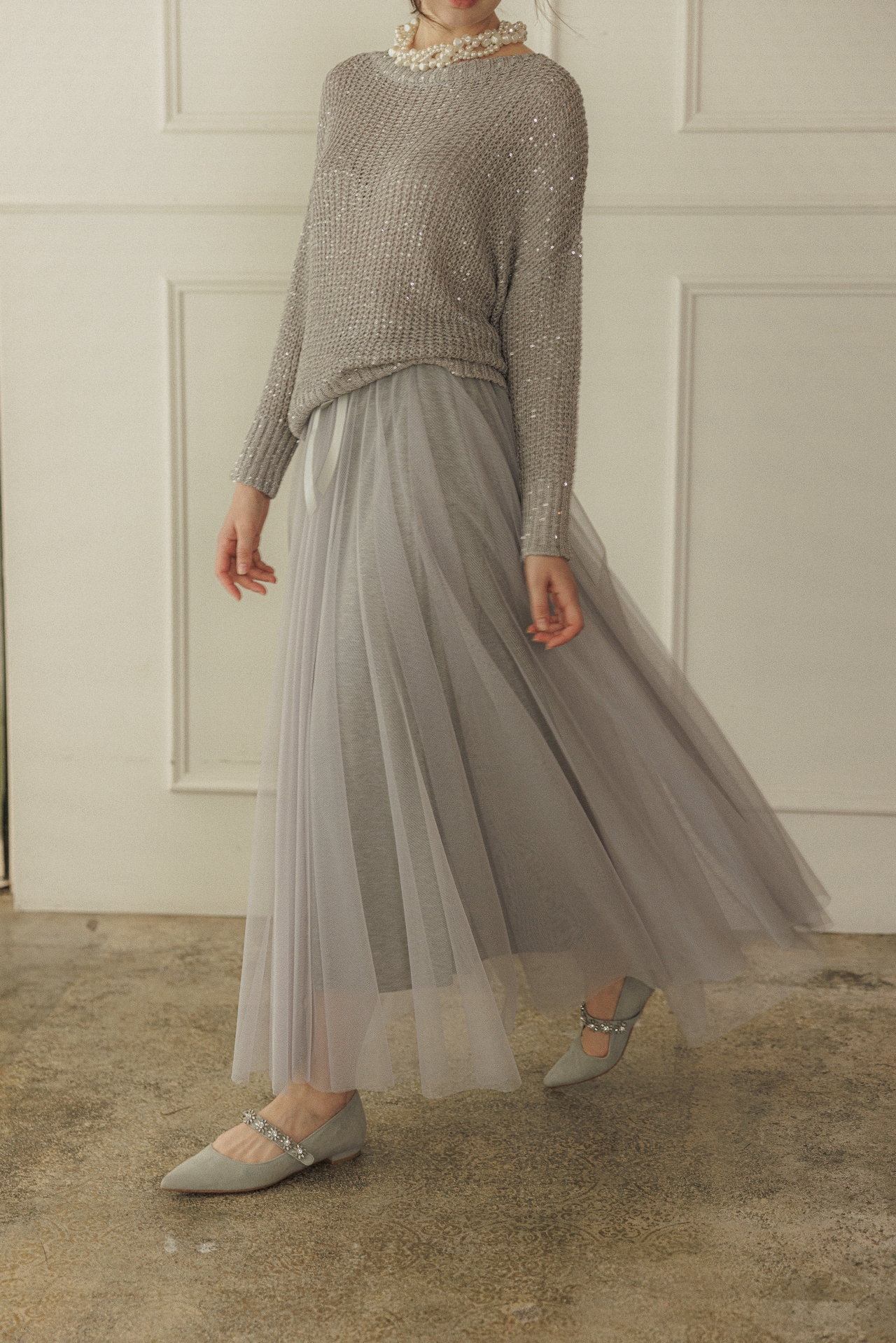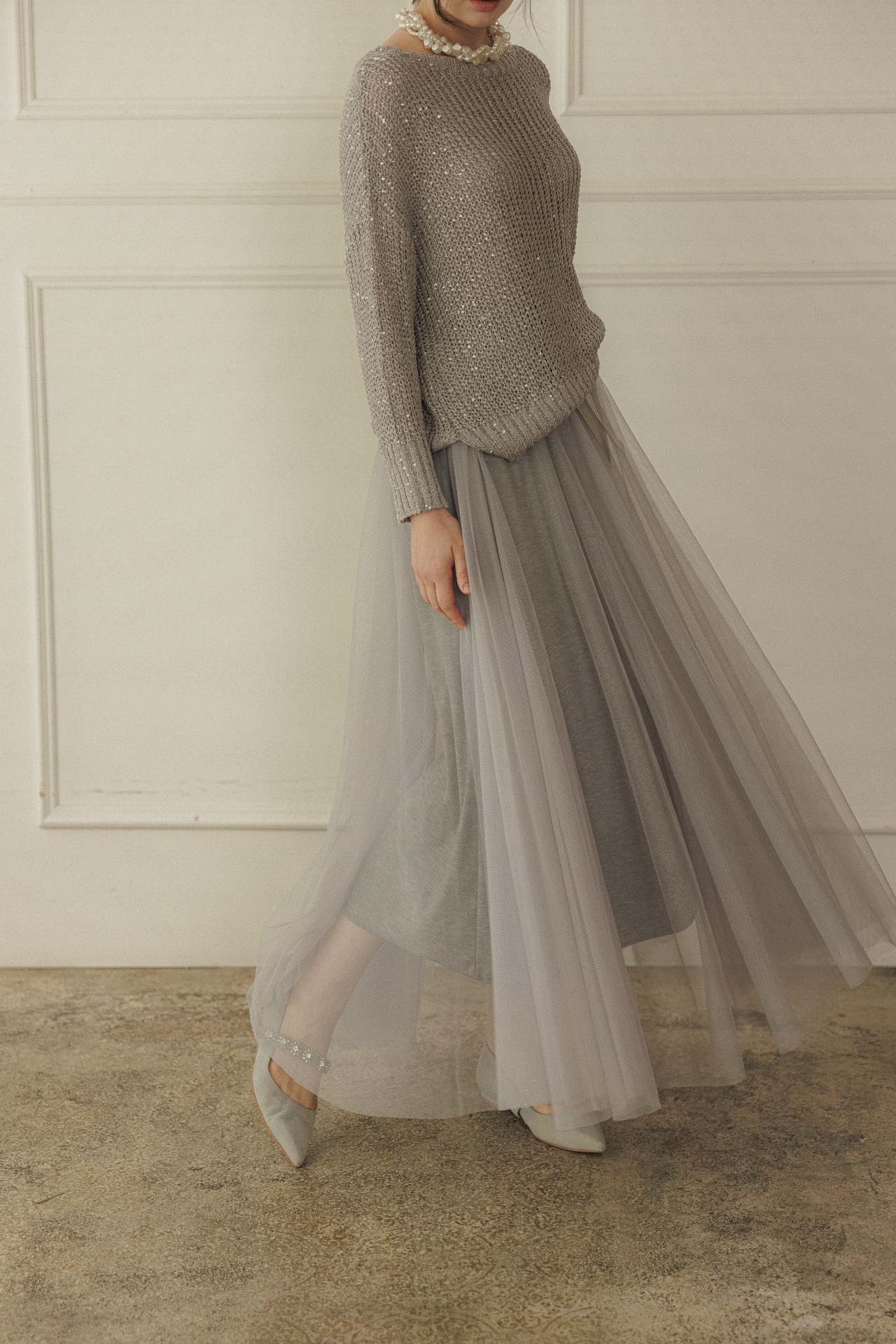 튤 소재를 주름 잡아 층이 진 실루엣을 이루었으며, 비스코사 안감을 덧대 마감했습니다. 웨이스트 밴드의 리본 트리밍이 포인트로 전체적으로 볼륨감 있게 주름을 잡은 튤 스커트이며, 부드러운 시스루 튤을 섬세하게 주름 잡아 심플한 A라인 실루엣을 그려냈습니다.