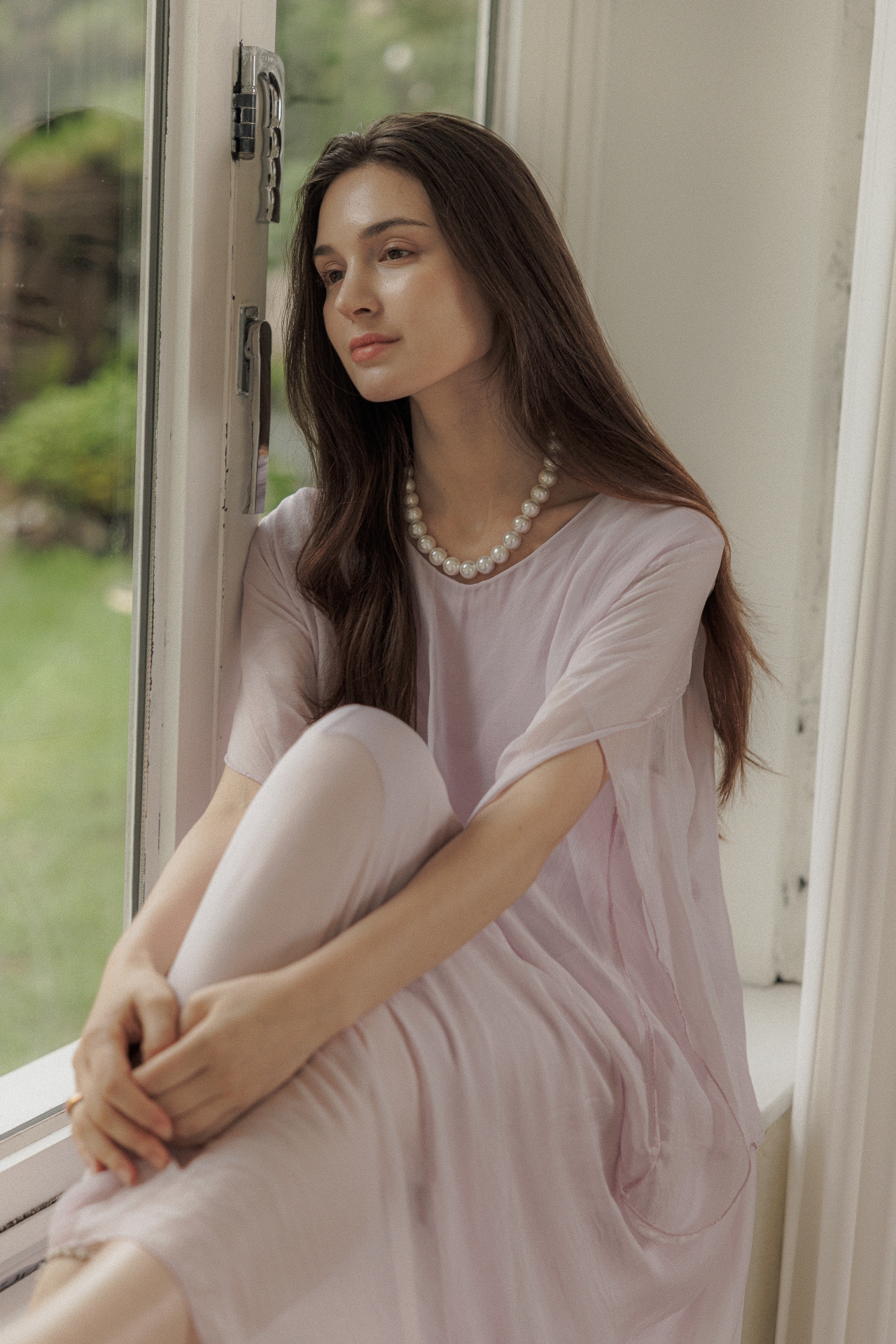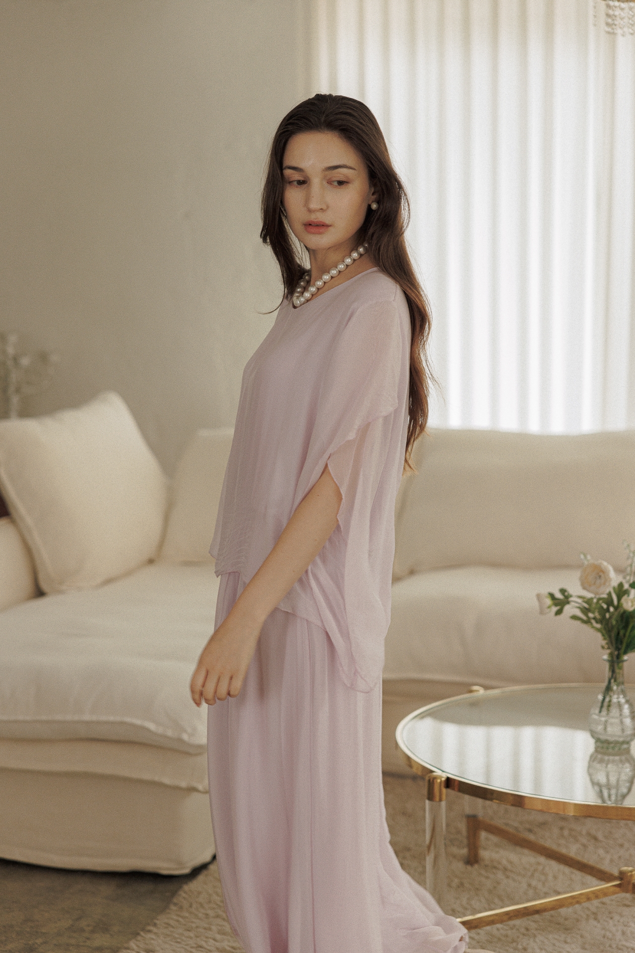 우아한 분위기를 표현한 핑크 및 퍼플 톤 실크 드레스로 전체적으로 우아하게 드레이핑되는 실루엣을 그려냈습니다. 부드러운 실크 소재와 소프트한 색조가 우아한 무드를 자아내고, 고리처럼 연결되어 흐르듯 떨어지는 날개 소매가 우아하게 하늘 거리며 근사한 실루엣을 연출합니다.