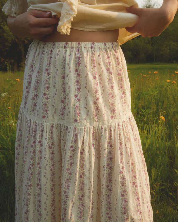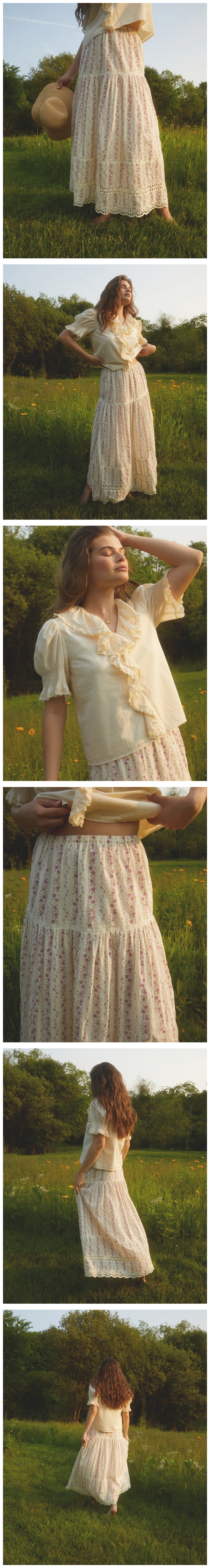 희미한 핑크 코튼 스커트는 사랑스러운 디티 플로럴 프린트와 정교한 아일렛 레이스 트림이 어우러져 섬세하고 여성스러운 분위기를 자아냅니다. 층층이 쌓인 듯한 부드러운 원단은 우아한 움직임을 선사하며, 신축성 있는 허리밴드는 편안하고 편안한 착용감을 선사합니다.