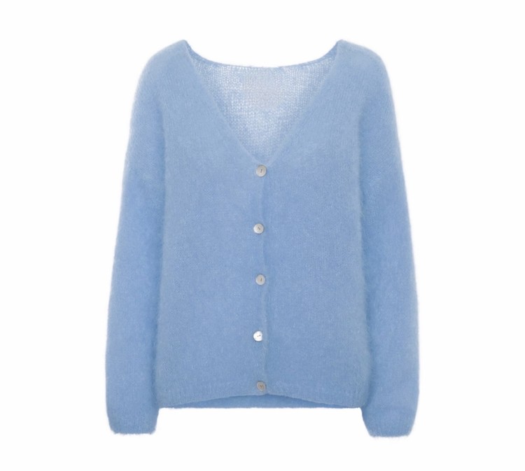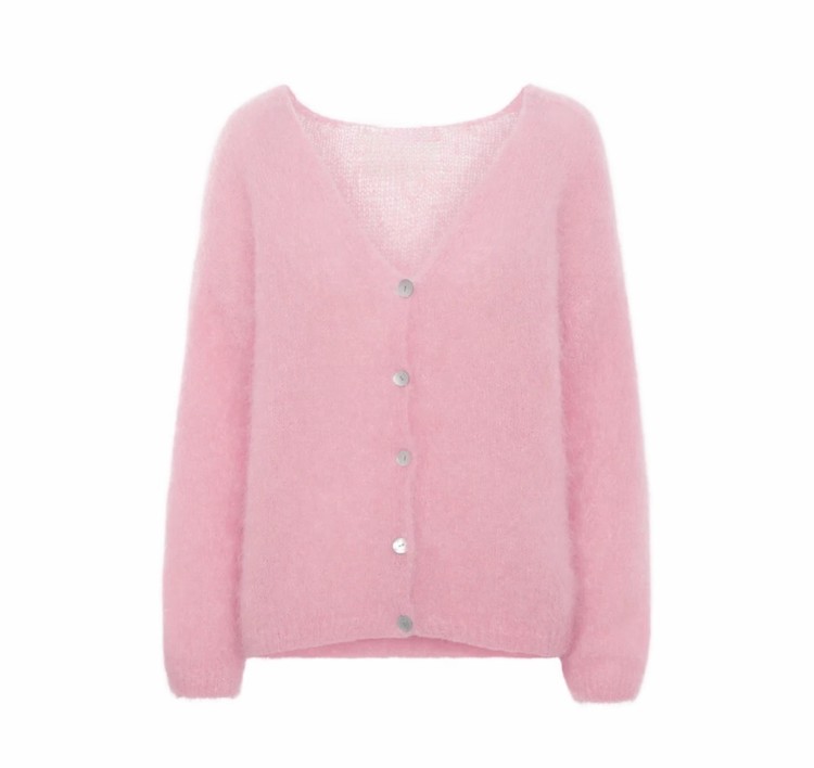 이탈리아산 모헤어 니트웨어 소재로 제작된 가디건은 앞이나 뒤에 버튼이 있는 여러 가지 방법으로 착용할 수 있으며,