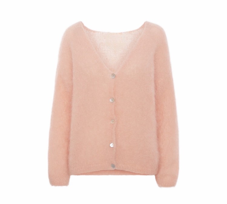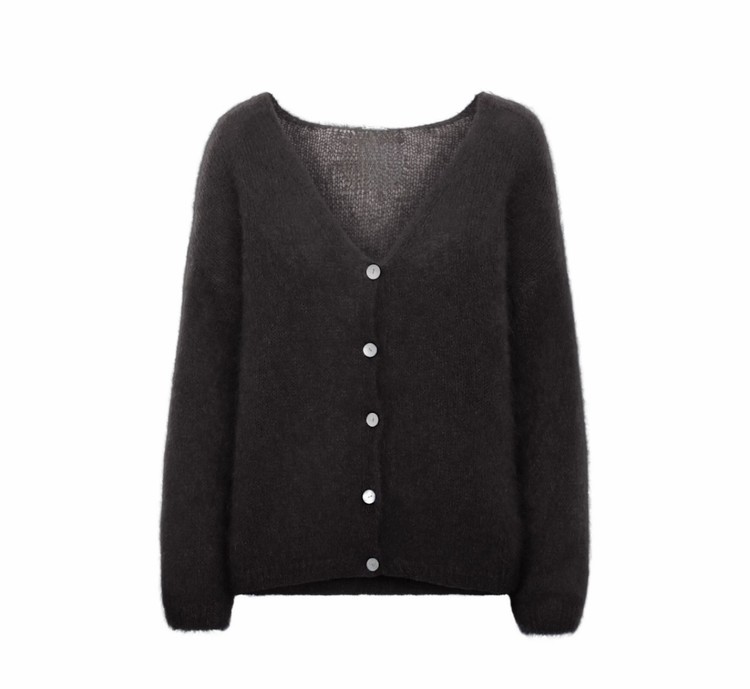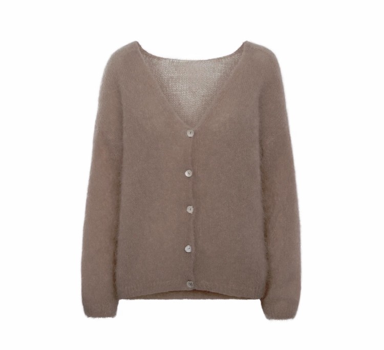 이탈리아산 모헤어 니트웨어 소재로 제작된 가디건은 앞이나 뒤에 버튼이 있는 여러 가지 방법으로 착용할 수 있으며,